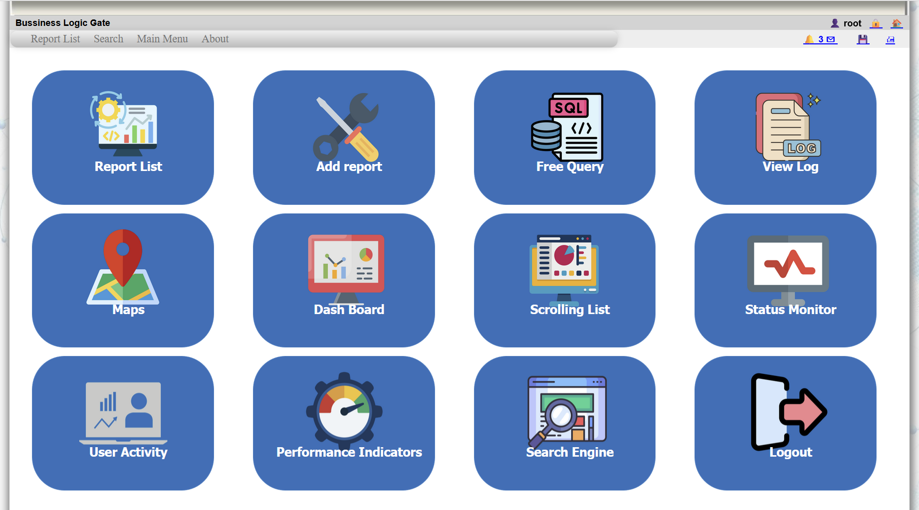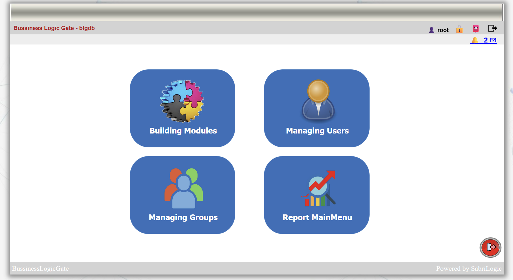 4: Main menu shows four main optins building module, Users, Groups and managing reports